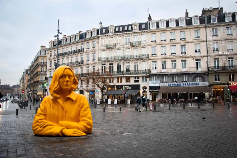 'Romy' is a monochrome bust of an enigmatic young woman, who appears to emerge from the ground. She is the perfect embodiment of a traveler —looking towards the Lille Flandres Train Station, she will welcome visitors from around the world, faithful to the Lille tradition. Sculpture by Xavier Veilhan, 2019.